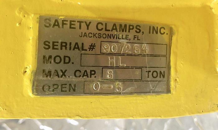 Safety Clamps, Inc. Model HL 8 Ton Capacity 0-3 inch opening. Condition is Used. Shipped with UPS Ground same day if purchased before 12 p.m. CST. This listing is for an individual clamp.